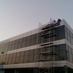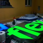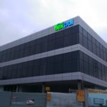 Wykonanie i montaż logotyp firmy Flexpol na elewacji frontowej biurowca firmy. Wykonany jako litery blokowe na stelażu aluminiowym umożliwiającym jego schowanie pomiędzy panele elewacyjne. mn