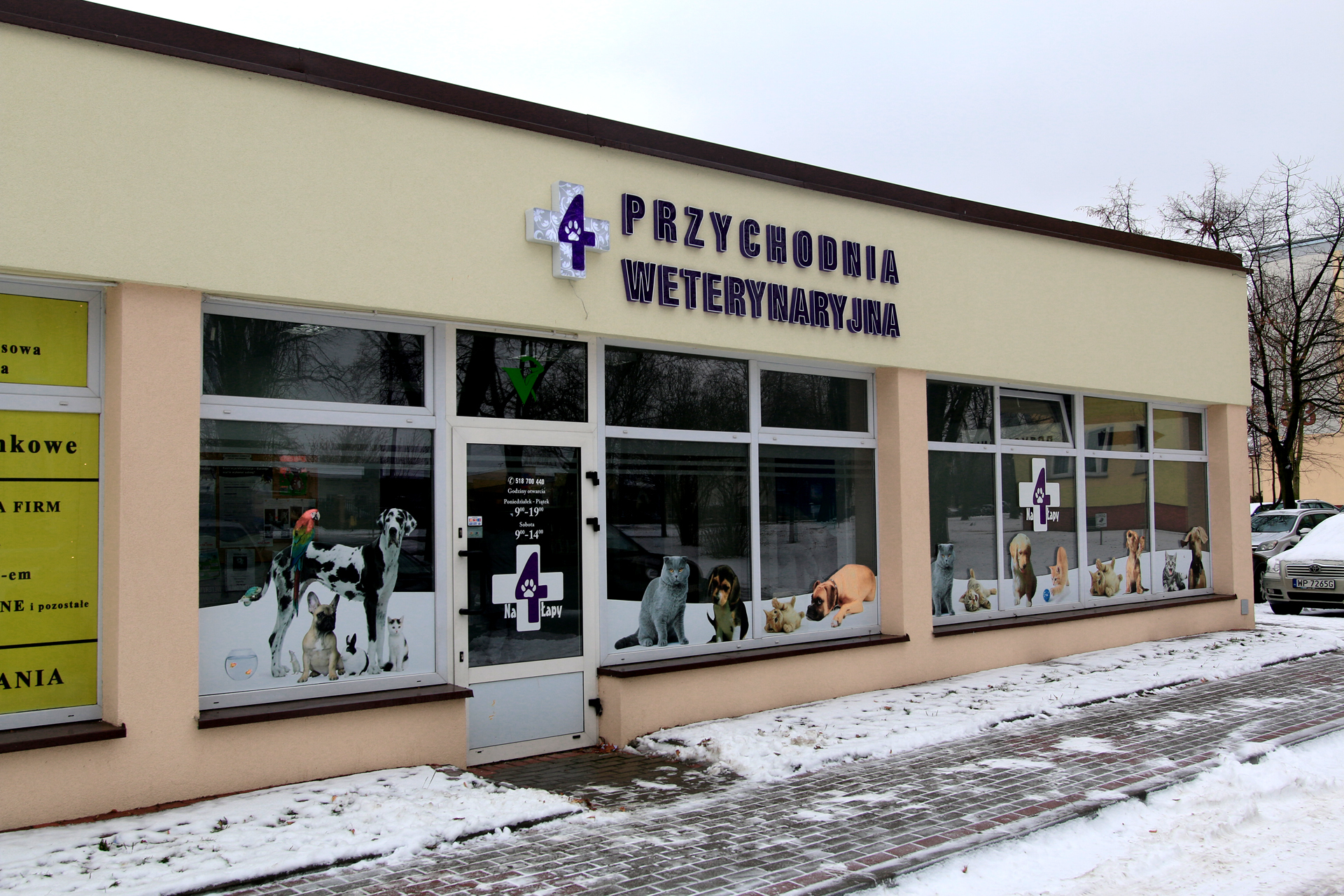 Znakowanie zewnętrzne przychodni weterynaryjnej poprzez wyklejenie witryn, liter przestrzennych na elewacji oraz logotypu w systemie liter blokowych.